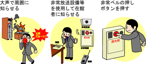 大声で「火事だー!火事だー!」と叫びながら、火事であることを周囲に知らせるとともに、非常警報設備(非常ベル)の押しボタン、自動火災報知設備の発信機を押しましょう。
